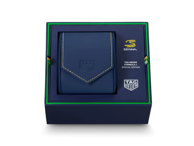 鮮やかなイエローのラバーストラップを合わせ、3本のストライプを配したディープブルーのボックスに収められ、付属のトラベルポーチはセナのヘルメットカラーで彩られ、開封の所作までコレクション体験として完結します。