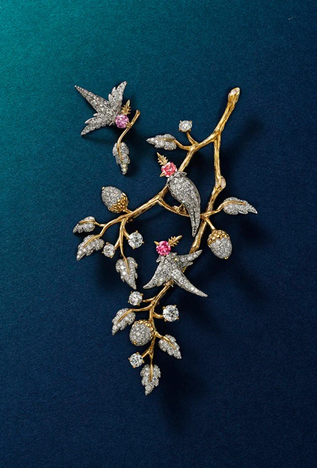 1965年に誕生した「バード オン ア ロック」は、ティファニーの芸術性と職人技を象徴する代表作として知られています。今回、ナタリー・ヴェルデイユとデザインスタジオが手掛けた新作では、伝説的なアイコンが新たな時代の表現へと昇華しました。1.45カラットを超えるアーガイル ピンク ダイヤモンドをまとった鳥が、繊細な彫刻を施したゴールドの枝に優雅にとまり、葉とドングリのモチーフには529石・総計11カラットを超えるホワイトダイヤモンドが散りばめられています。煌めきの中に生命感が息づくこのデザインは、ティファニーの創造性が時を超えて進化し続けていることを物語ります。