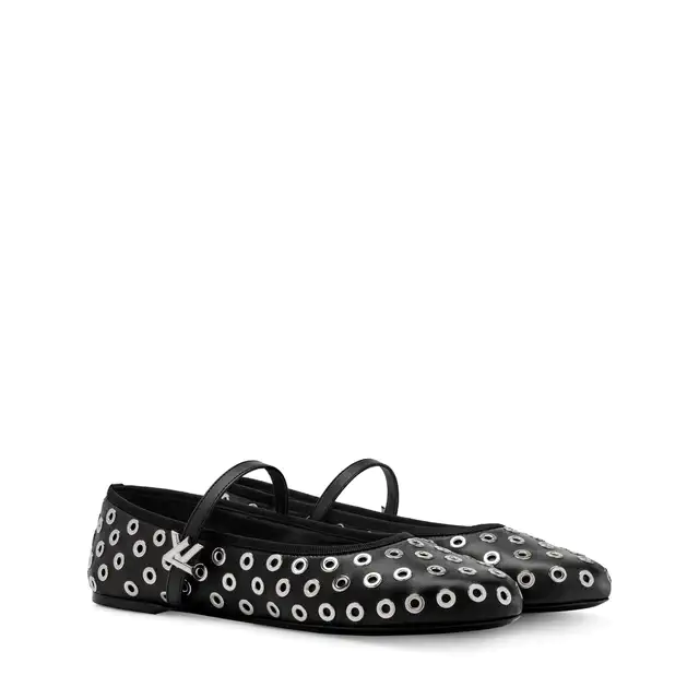 「ロミー バレリーナ」は、ルイ·ヴィトン 2026クルーズ·ファッションショーにおける中世の鎧のモチーフを足元へと落とし込んだ一足です。柔らかくなじむラムレザーで全体を包み込み、その表情の上にシルバーカラーのアイレットをリズミカルに配することで、鎧を思わせるニュアンスを加えています。フェミニンなムードを生み出すラウンドトウのフォルムに、細身のストラップを交差させることで足元をすっきりと見せ、中央にはLV ツイストのアクセサリーがさりげないアクセントとして光ります。アウトソールには上質なレザーを採用し、見えない部分まで丁寧に仕上げることで、クルーズシーズンのドレスからデニムまで幅広いワードローブに寄り添う一足に仕上がっています。