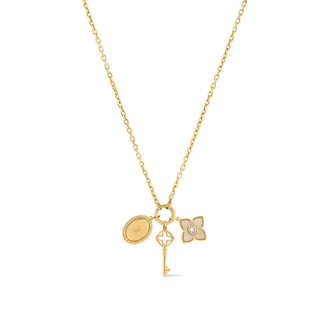メゾンの長い歴史に敬意を払いながら生まれた「ネックレス・LV シグネット」は、伝統と今のムードをブレンドした一本です。繊細なゴールドカラーのチェーンに、鍵、モノグラム・フラワー、そして精緻なLVサークル・シグネットという3つのチャームが連なり、ルイ・ヴィトンのエスプリをリズミカルに表現しています。重ね付けにもなじむ華奢なチェーンと、存在感のあるチャームの組み合わせが首元に奥行きを生み、シンプルなトップスもぐっと印象的に見せてくれます。仕事終わりにそのままディナーに向かうようなシーンでも、さりげなく個性を引き出してくれるステートメントピースとして活躍しそうです。