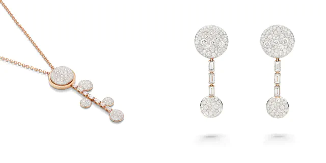 ローズゴールドの地金に、ブリリアントカットとバゲットカットのホワイトダイヤモンドを組み合わせた今回の新作群。その中心となるのは、「サッビア」ディスクを主役にしたラリアットネックレスです。バゲットダイヤモンドの直線的なラインと、小さな「サッビア」ディスクが連なるカスケードが、軽やかに動きながら華やかさを添えます。モダンでありながら女性らしい柔らかさを備えたデザインは、ポメラートが培ってきた自由な美意識を象徴しています。