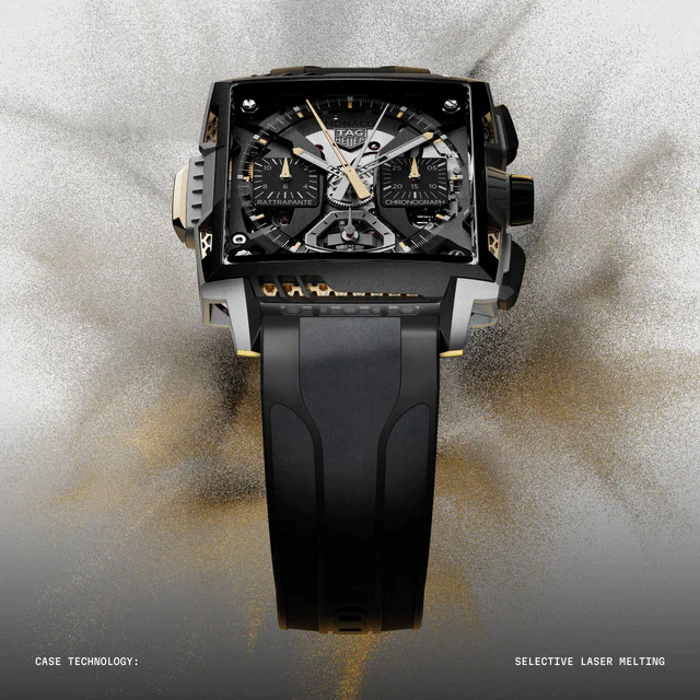 では、この技術がどのように機能しているのかを見ていきます。一般的なウォッチケースは、CNCフライス盤を用いて単一の素材ブロックから複数の部品を削り出して成形する「引き算の製造」が主流です。一方でSLMは、3Dプリントに近い発想を持つ「足し算の製造」に属します。「タグ・ホイヤー モナコ スプリットセコンド クロノグラフ エア 1」は、この新しいアプローチによって生まれたタイムピースであり、時計づくりにおける立体構造の自由度を大きく押し広げています。