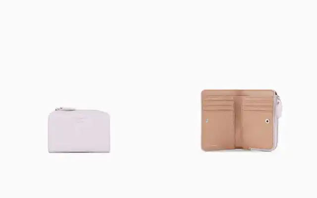 まず注目したいのは、二つ折りタイプのウォレットです。手に取ったときに感じるしっとりとした風合いは、柔らかな光沢を湛えたディアスキン仕上げのイミテーションレザーによるものです。スナップボタンで素早く開閉できるつくりになっていて、内部にはジップ付きコインパースとカードスロットがレイアウトされています。必要なものを迷わず取り出せる構造でありながらボリュームは抑えられているため、小さめバッグにも収まりやすいバランスです。フロント部分には、エンポリオ アルマーニを象徴するシルクスクリーンロゴがさりげなく配され、ミニマルなフォルムの中に印象的なポイントを添えています。
