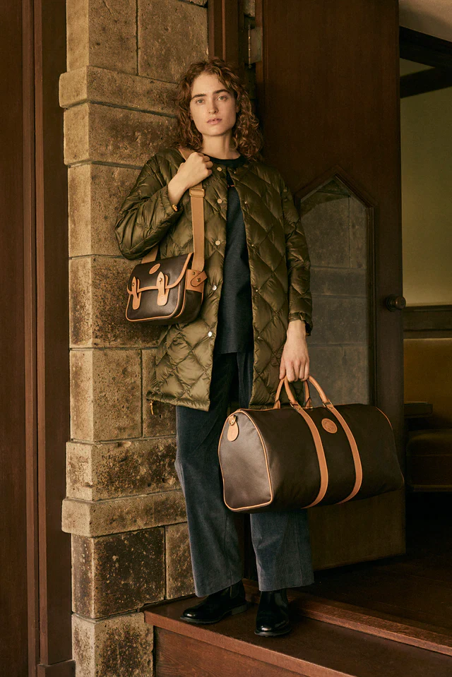 シリーズ名にもなっている独自素材「レザー・ラックス」は、「LEATHER LUX」コレクションの核となる存在です。耐久性に優れ、お手入れもしやすいPVC素材に、本革のようなシボを施してコーティングしたマテリアルで構成されています。かつてはこのPVCを、重厚感のあるコットンの基布にのせていたため、タフさと引き換えにバッグ自体の重量感も際立つ仕様でした。復刻にあたってはこの構造を見直し、基布を薄く軽やかなスエード調の起毛素材へシフト。コーティングに使うPVCの厚みもできる限り抑え、全体として重量を削ぎ落としています。そのうえで、伝統的なイタリアンレザーをトリムに用いることで、往年の雰囲気を受け継いだクラシックな表情をキープ。ラインアップはブランドを象徴するキャリーオールM・S、そしてダッフルバッグの3型で構成され、カラーはクラシックなブラウンと、都会的なスタイルにも合わせやすいブラックの2色展開です。シーンを問わず使いやすい構成でありながら、ひと目でハンティングワールドと分かる存在感が、旅好きな大人のワードローブを支えるシリーズになりそうです。![]()