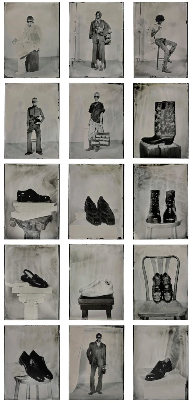 その流れを受けて続くフォト・インスタレーションでは、ジェイデン・スミスが手がけた写真作品がクローズアップされます。その一部は初期の写真技法を用いて撮影されており、カメラマンが布の下に身をかがめてシャッターを切り、銀と化学溶液を用いた手作業の現像によって少しずつフォルムが浮かび上がるプロセスを経ています。選び抜かれた写真は、メゾンのシグネチャーを思わせる赤い光に照らされたネガとしてプリントされ、空間に配置されます。デジタル全盛の時代にあえてアナログな手法を用いることで、クリスチャン ルブタン メンズのコレクションに通じる職人技への敬意や、時間をかけてものを仕上げる行為の尊さが視覚的に表現されています。