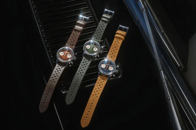 新たに加わったラインナップのうち2モデルは、ハンターグリーンと温かみのあるブラウンというカラーが主役です。いずれも外周が深いトーンから中央に向かってふわりと明るくなるスモーキーなグラデーションダイヤルを採用し、「イントラマティック クロノグラフ H」の柔らかな曲線を描くシルエットを、光のニュアンスとともに印象的に強調しています。3つ目のモデルは、鮮やかなブルーとオレンジのコンビネーションが象徴的な一本で、ブラウンのヌバックレザーストラップと組み合わせることで、ソフトな質感と頼もしさを両立。当時のトラックにまつわる素材使いやカラーコーディネートを思い起こさせる構成となっていて、個性豊かな色彩を時計で楽しみたい人にも心を惹きつける提案です。