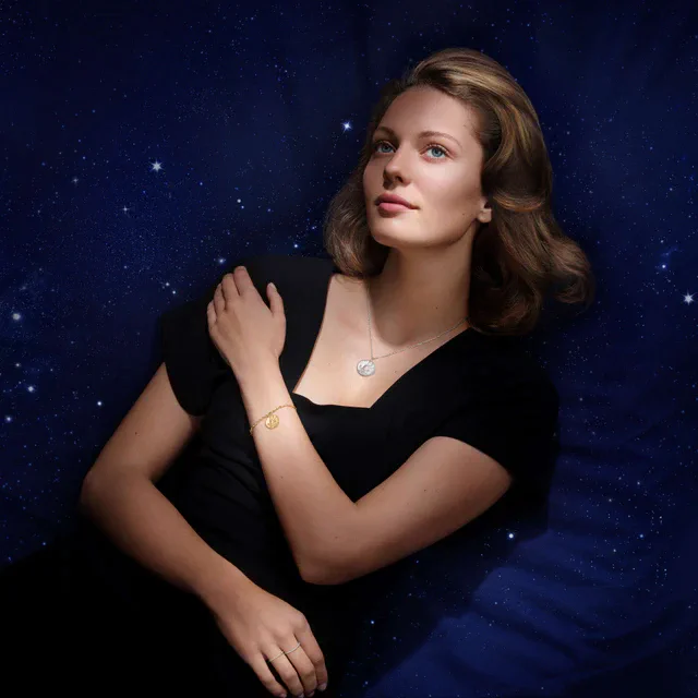 ヴァン クリーフ&アーペルが星座をテーマとして取り入れたのは、メゾンのコレクション史において1950年代にさかのぼります。星座モチーフをあしらったゴールドメダルは、1906年の創業以来大切にしてきた幸運のお守りジュエリーの系譜に連なる存在として打ち出され、発表と同時に大きな成功を収めました。その後、このメダルは日常使いのジュエリーを手頃な価格で提案するラ ブティックのコレクションの一部となり、さまざまなサイズ展開で登場します。自由に組み合わせて楽しめるチャームやカフリンクスにも用いられ、さりげなく星座のモチーフを取り入れる提案として愛されてきました。