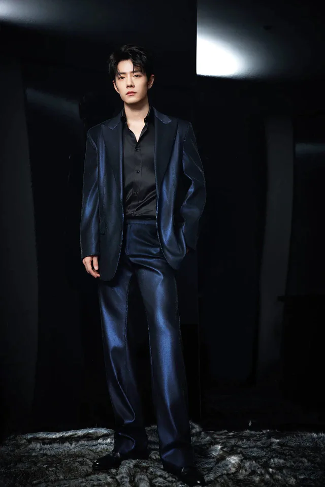 グローバル・ブランドアンバサダーを務める肖戦(シャオ・ジャン)は、その役割にふさわしい存在感で登場しました。身にまとったのは、カスタムメイドのメタリックブルー スパンコール スーツにブラックサテン シャツを合わせたルック。光を受けて表情を変えるスパンコールの生地が、シャープなテーラリングによって落ち着いたシルエットに整理され、ステージとレッドカーペットの両方を意識した装いに仕上がっています。足元には、ダブルGディテールをあしらったブラック レザー ブーツをセレクト。アイコニックなモチーフをモードなブーツに落とし込むことで、グッチらしさと現代的なバランス感覚を同時に表現するスタイリングとなりました。