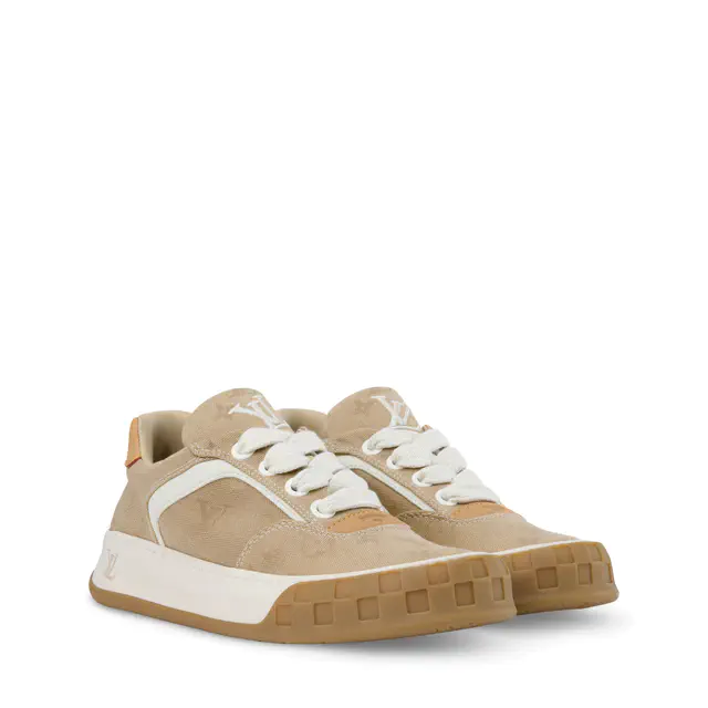 「LV ティルテッド スニーカー」は、デニム地のアッパーに控えめなモノグラム・パターンを走らせたデザインが特徴です。2000年代初頭のスニーカーからインスピレーションを得たシルエットをベースに、メゾンを象徴するヌメ革のトリミングが加わることで、カジュアルな素材感に品のあるアクセントが添えられています。シュータンとアウトソールには、傾斜したLV イニシャル シグネチャーが配されており、このグラフィカルなディテールがモデル名の由来となっています。さらにアウトソール前面にはダミエ・パターンがあしらわれ、歩くたびにルイ・ヴィトンらしい遊び心がさりげなく覗く一足です。