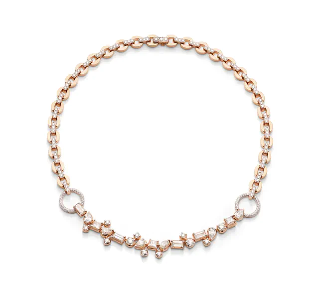 コレクションを象徴するローズゴールドのネックレスは、彫刻作品のような佇まいを持つ一本です。1970年代のポメラートのアーカイブから取り出された特徴的なラウンドリンクチェーンのデザインを出発点にしつつ、現代的な感覚で再解釈しています。リンクの上には266石ものブリリアントカットダイヤモンドが配され、まるでオートクチュールのドレスに施された繊細なステッチのように、チェーンの輪郭をなぞりながら連なります。その中心にはペアシェイプ、プリンセス、バゲットといった異なるファンシーカットを施したダイヤモンドが計13石レイアウトされ、滑らかなラウンドパヴェと鋭いラインを描くファンシーカットの幾何学がぶつかり合うことで、光が複雑に反射します。静かなフォルムに潜むこのコントラストこそが、意外性のある輝きを生み出す鍵になっています。