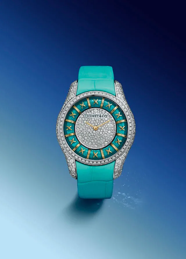 エナメル ウォッチに合わせて用意されたアリゲーターストラップは、手首を包み込むレザーの表情と、留め具にあしらわれたダイヤモンドのきらめきがバランスよく共存する仕立てです。ストラップは、43石のラウンドブリリアントカット ダイヤモンドをセットした18KイエローゴールドまたはホワイトゴールドのTバックルによって留められ、バックル自体がひとつのジュエリーのような存在感を放ちます。さらにハイジュエリーモデルでは、18Kホワイトゴールドケースにティファニー ブルー エナメルを施し、666石(合計4.48カラット)のダイヤモンドをセットした18Kホワイトゴールドのフルパヴェ ブレスレットを組み合わせています。ウォッチとブレスレットが一体となったこのモデルは、フォーマルなシーンの主役としても成立するほどの華やかさを備え、ティファニーが提案するハイジュエリー ウォッチの到達点のひとつを示しているようです。