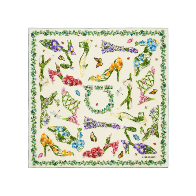 フェラガモのシルクコレクションの伝統を色濃く反映した今回のラインナップは、花や葉、花弁を巧みに配置した独創的な構図で構成されています。歴史を彩るシューズや象徴的なガンチーニを植物モチーフと交差させ、ブランドのヘリテージを現代の言語で語り直す試みは、フェラガモならではのクリエイティブスピリットの賜物です。アイコニックな意匠が自然の造形と共鳴し、新たな芸術へと昇華される様子は、多くのファッショニスタの知的好奇心を刺激するに違いありません。