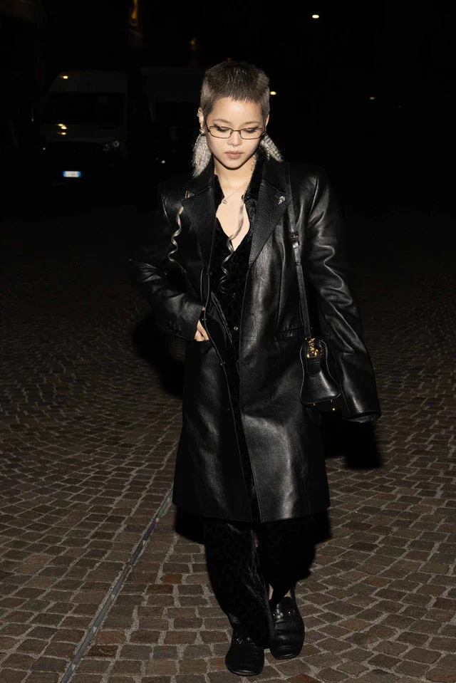 COCONAのミラノ到着ルックは、グッチのDNAを詰め込んだアイテムを重ねながらも、モノトーンと質感のコントラストで今らしくまとめた点が印象的です。ブラックレザーコートとGGパターンのベルベットというクラシカルな組み合わせに、ホースビット ローファーやウェブ ストライプを配したボストンバッグを加えることで、ブランドを象徴するコードが自然に連なり、一目でグッチの世界観であることが伝わります。同時に、COCONAの存在が加わることで、これらのアイテムはラグジュアリーなフォーマルウェアではなく、音楽やストリートの空気を吸い込んだリアルクローズとして映ります。Gucci Primaveraコレクションを前に披露されたこのスタイルは、新生グッチがどのように世代やカルチャーを横断しようとしているのか、その方向性を感じ取る手がかりとなりそうです。
