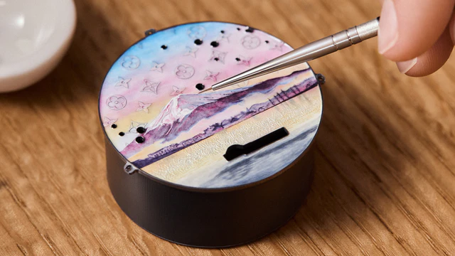 幽玄な朝霧に包まれた富士山や、極細の筆で描かれた灌木の一葉一葉に至るまで、エナメル職人のサヴォアフェールが隅々にまで行き渡っています。仕上げに施されたフォンダンエナメルの研磨が、300時間以上を要した色彩の物語に深い奥行きときらめきを与えました。さらに、本品にはアニエールのアトリエで製作された専用トランクと、アンティークから着想を得たドクターズバッグが付属。延べ1,000時間を超える情熱が注がれたこの傑作は、審美眼を持つ時計愛好家を魅了し続け、ルイ・ヴィトンのウォッチメイキングにおける無限の可能性を証明しています。