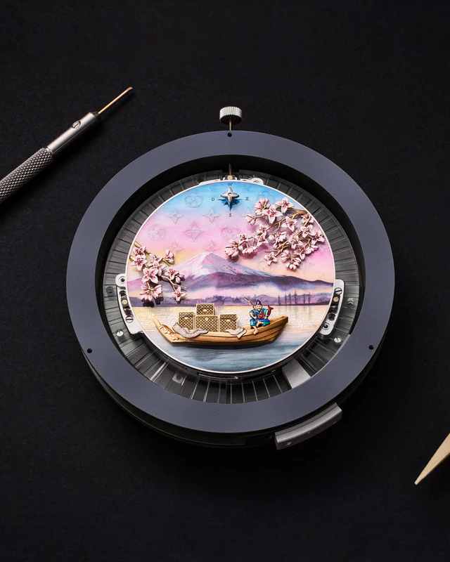 旅の真髄を象徴するこのウォッチは、4つの緻密な可動要素を備えたミニチュアシアターをダイアル上に展開します。12時位置で回転するゴールドのコンパスローズの下、福の神えびす様が鯛を抱えて木製の釣り船を操り、開閉するトランクからはモノグラム・フラワーが顔を覗かせます。この情景を彩る桜の花々は、オートマタによって風に揺れるような情感溢れる動きを見せ、ベゼルを飾る60石のバゲットカットサファイアが、空のグラデーションと見事に調和。ケースバックに針を配した設計が、この壮麗な舞台を余すところなく際立たせています。