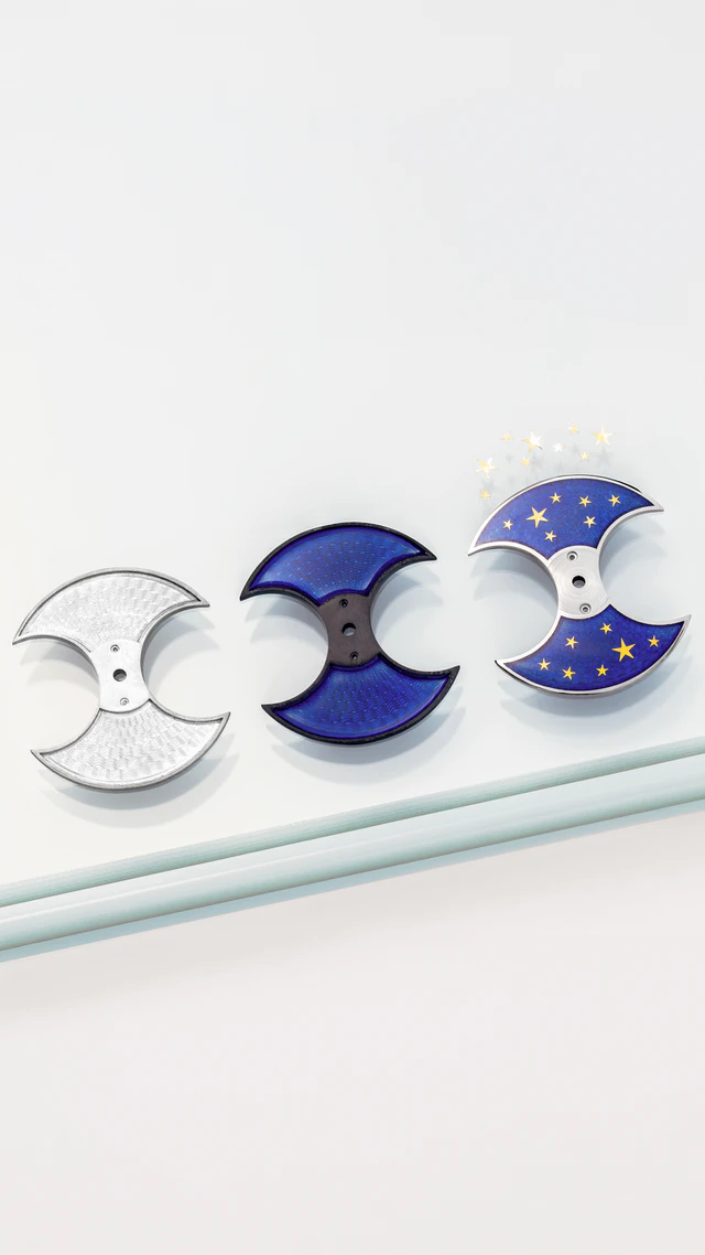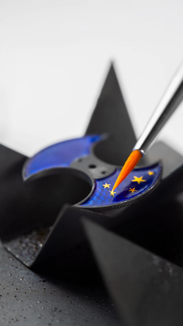 ホワイトゴールドのダイアルに、100年以上前に製造された手動旋盤を使ってギョーシェ彫りを刻み込む。ルツェルンのアトリエで繰り広げられるのは、現代のテクノロジーに頼らない、まさに職人の魂を削るような真剣勝負です。その上から半透明のブルーエナメルを幾層にも重ね、一瞬の過ちも許されない焼成プロセスを経て、ようやく深いネイビーの空が姿を現します。さらに拡大鏡を覗き込みながら、極薄の金箔(パイヨネ)から切り出された小さな「星」を、手作業で一つひとつ星空へと繋ぎ止めていくのです。
