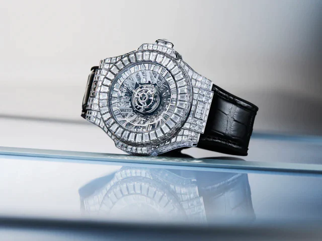 バゲットカットとファンシーカットを交互に配した幾何学的なパターンが、インビジブルセッティングとクローズドセッティングの融合により、立体的なリズムを奏でます。かつての「ブラック キャビア・バン」から続く希少な系譜を継承しつつ、本作は独創的なセッティングの誕生10周年を記念する特別な重みを備えています。素材への深い理解とたゆまぬ革新が、挑戦的な造形を可能にしました。ウブロが築いてきた100万ドルを超えるタイムピースの歴史が、この一本に鮮やかに凝縮されていると感じられます。