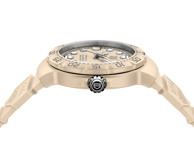鮮やかな色彩を最大限に引き立てつつ、軽快な装着感を実現するために採用されたのが、THポリライト製のケースです。メルセデス針や双方向回転ベゼル、そしてシグネチャーシールドといった「タグ・ホイヤー フォーミュラ1」の系譜を象徴するディテールを継承することで、革新的な素材使いの中にも伝統の重みがしっかりと息づいています。最先端の軽量素材とアイコニックな造形が融合したこの佇まいは、アクティブな動きを妨げず、一日中快適に寄り添ってくれる頼れる味方となるはずです。
