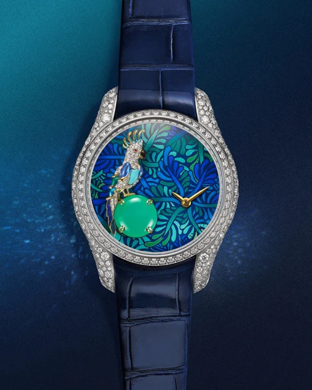 18Kホワイトゴールドのケースには、ホワイトダイヤモンドが贅沢に配され、主役であるオウムのボディにはターコイズ、瞳にはピンクサファイア、くちばしにはオニキスが添えられています。ミニチュア彫刻や手彩色といった技法を組み合わせ、32時間もの情熱を注いで作り上げられたこの鳥は、ダイヤモンドとの鮮烈な対比によって生命を宿したかのような躍動感を見せます。冠羽や羽の一枚一枚まで細やかに描かれた色彩は、止まり木であるクリソプレーズの鮮緑と響き合い、装いに気品ある華やぎを添えることでしょう。