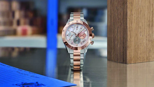 特徴的なシャープな構造と黄金比のようなプロポーションはそのままに、直径41mmのケースはコントラストが際立つツートーンデザインへと昇華されました。堅牢なステンレススチールのボディに、ローズゴールドのベゼルやリューズ、プッシャーが温かみと深みのある表情を添えています。アクティブな週末から落ち着いたビジネスシーンまで対応する絶妙なスタイルは、装いの要として、ワードローブの核を担う頼れる味方となるはずです。