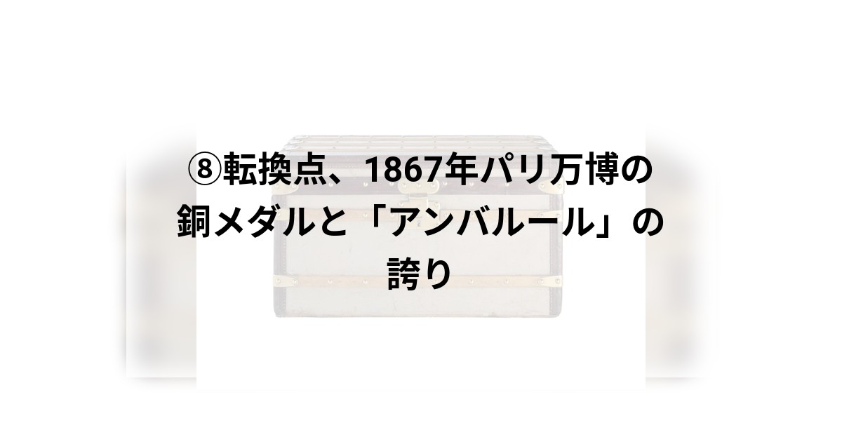1867年、ナポレオン3世が帝国の威信をかけて開催した第2回パリ万国博覧会。それは、ルイ・ヴィトンが単なる一介の職人から「世界のヴィトン」へと飛躍を遂げる、運命の舞台となりました。本稿では、名誉ある銅メダルを獲得し、近代的な旅の概念を定義した革新のトランク「グリ・トリアノン」から、公式には触れられることのない、当時のラベルが物語る「銀メダル」の謎や、梱包職人としての矜持を象徴する称号「アンバルール」の精神、さらには徳川幕府が初めて公式参加し、後にモノグラムの意匠にも繋がるジャポニスムの萌芽についても深く掘り下げます。産業宮の熱狂の中で、東洋の美と西洋の技が交錯した歴史的瞬間までを辿ります。